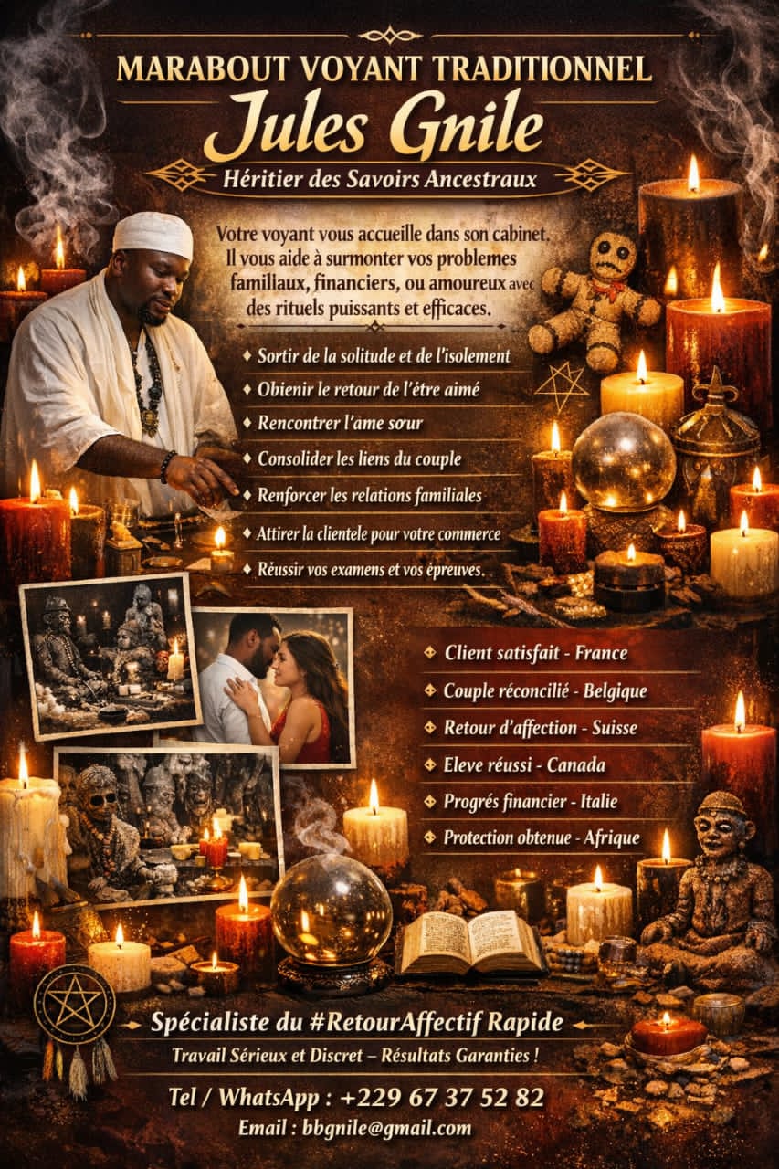 Le puissant medium voyant sérieux compétent Jules Gnile résout tout vos problème de couple rapide et immédiat . Mais vous avez perdu la raison de vivre depuis que votre amour vous a quitté ? Sachez que le retour affectif amoureux rapide et définitif de l’être Aimé est un rituel de désenvoutement rapide fiable et efficace, C’est un rituel d’Amour Rapide et Surprenant. Le medium sérieux Jules Gnile fait un rituel sérieux et efficace dans la discrétion total et assurée.
